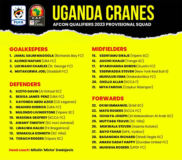 Uganda Cranes coach Milutin “Micho’ Sredojevic released a 30-player squad on Thursday, March 9 to start preparations for the upcoming the 2023 Africa Cup of Nations (AFCON) qualifiers.